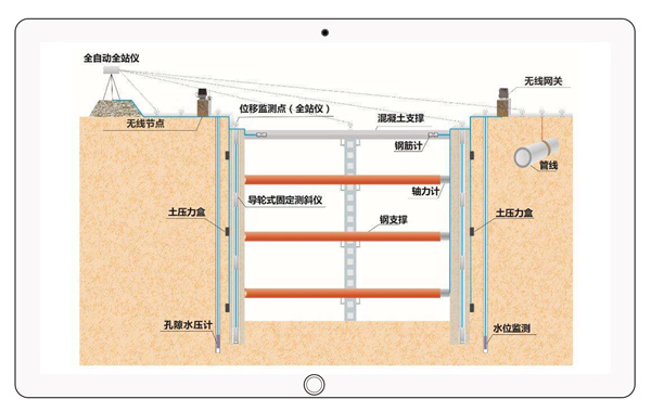 風險防范:在與地下管線相關的重點施工區域,可部署移動視頻智能分析監控設備實現24小時無死角監測,并智能識別管線保護區內的挖掘機和鉆機等施工設備; - 通過GPS定位、北斗定位、北斗高精度差分定位等設備,實現場地大型機械設備的定位監測; - 通過對中高壓燃氣管線及其他重要管線加裝光纖傳感器監測管線異常振動情況等; 在地鐵等重大地下工程的重點施工路段、鄰近重要道路且存在深基坑等危大工程的區域安裝傳感器進行動態監測。